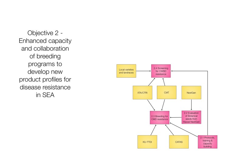 It was stated above that CMD2 was introduced into Thailand several years ago before the arrival of CMD into the region. Crosses were made with the elite variety HB80 and five out of many produced were found to carry the molecular markers related to resistance to CMD in chromosomes 12 and 14. There are few plants of these genotypes currently in the field. Kasetsart University is a leading institution in cassava breeding which has released successful varieties such as KU50, HB60 and HB80